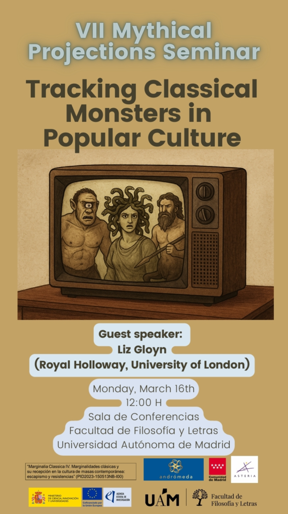Tenemos el placer de invitaros al VII Seminario “Mythical Projections”, que este año tendrá como tema la presencia de los monstruos clásicos en la cultura popular. El seminario tendrá lugar el lunes 16 de marzo a las 12.00, en la Universidad Autónoma de Madrid. El seminario tendrá lugar de manera presencia y online, y contaremos con la participación de Liz Gloyn, profesora en la Royal Holloway, University of London, y autora del volumen Tracking Classical Monsters in Popular Culture (Bloomsbury, 2019). Durante el seminario reflexionaremos sobre la naturaleza de diversos monstruos de la mitología clásica, qué les hace tan interesantes en nuestros días, y cómo y en qué formatos (cine, cómic, series de televisión, etc.) se han incorporado a la cultura popular. Se entregará certificado de participación a aquellos participantes que asistan presencialmente.